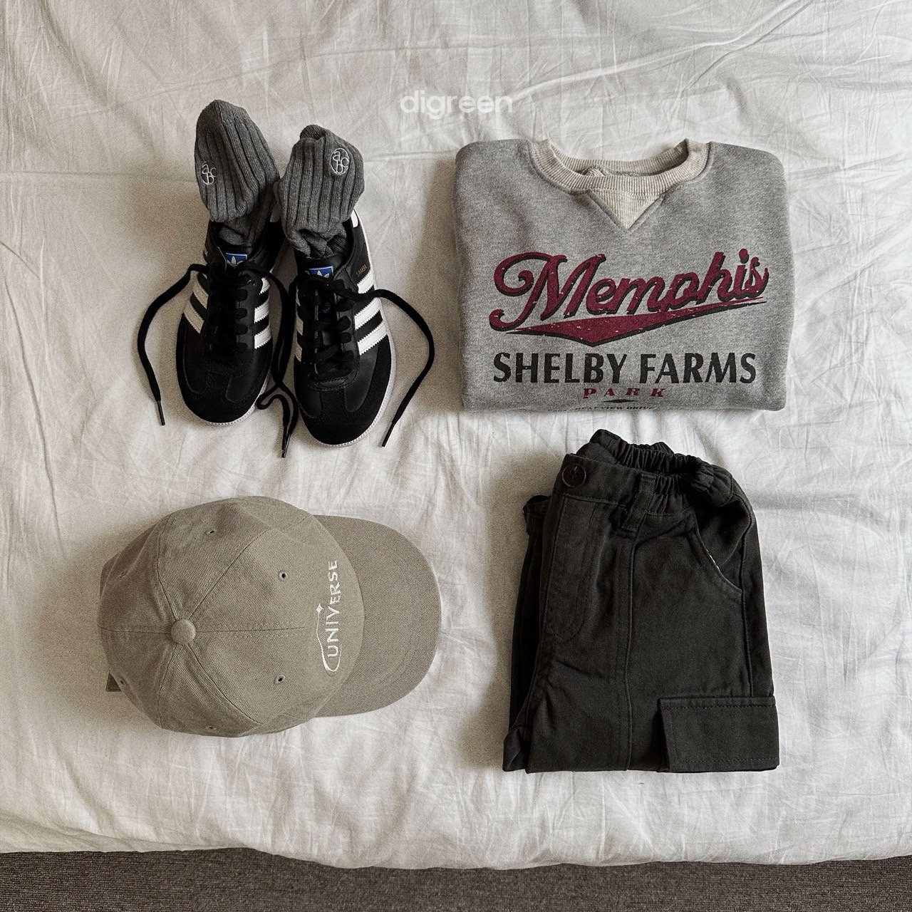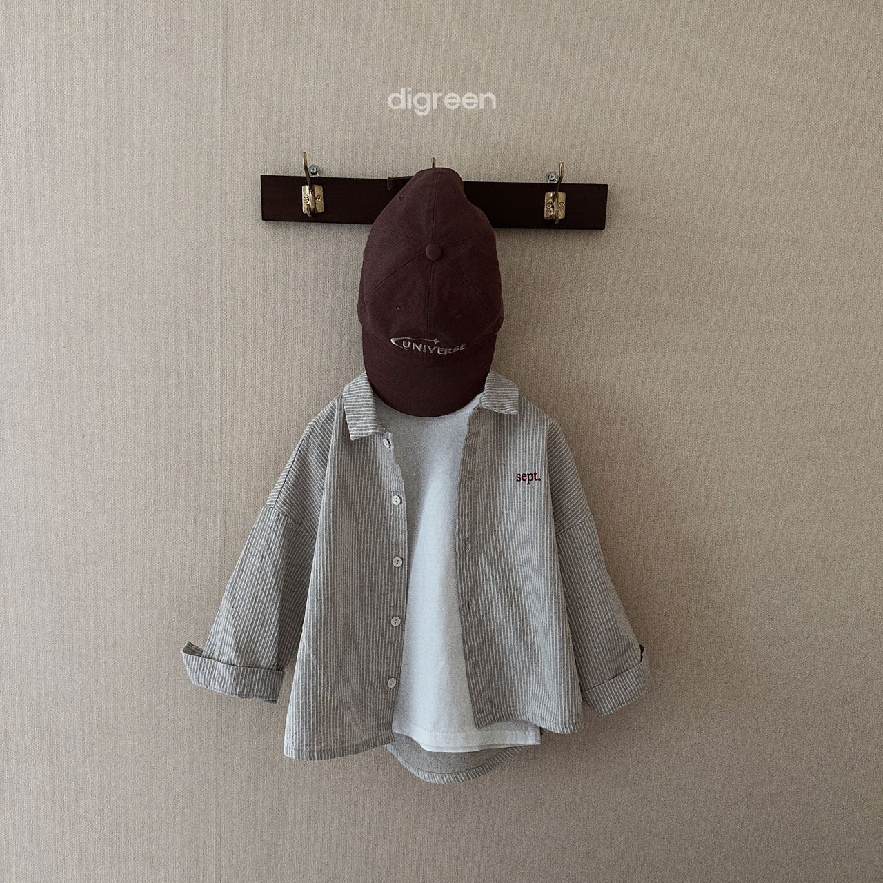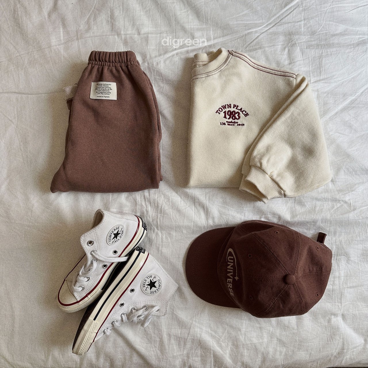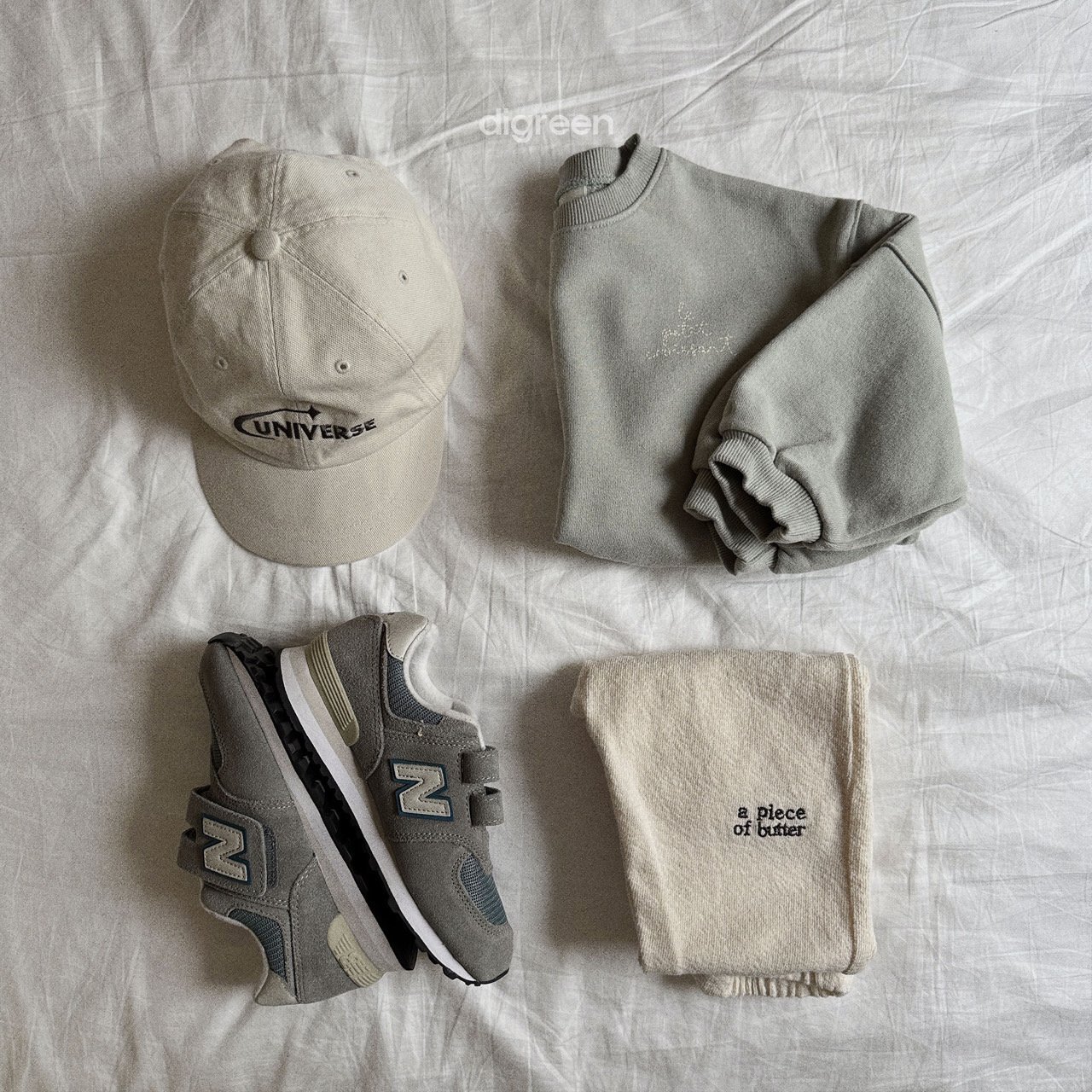 톤톤으로 들어가 은은하게 포인트가 되어주는 자수 레터링으로