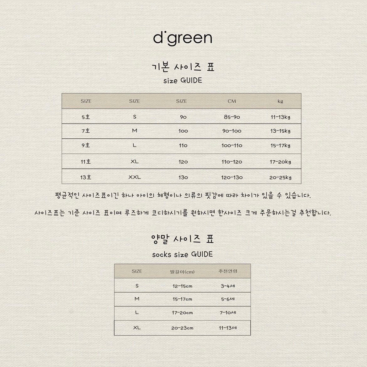 아이의 체형과 선호하시는 핏에 따라 사이즈 가감해주세요