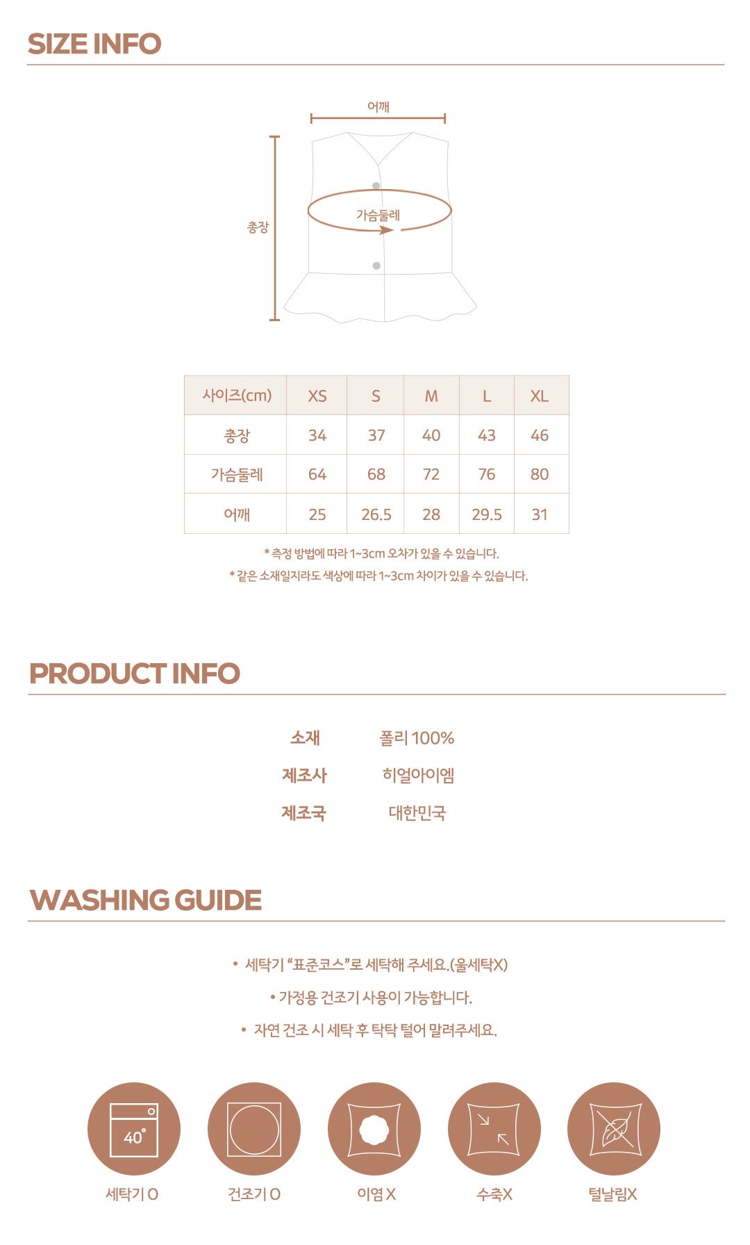 제품의 세탁 후 에는 어떤한 경우에도 교환,환불이 불가합니다